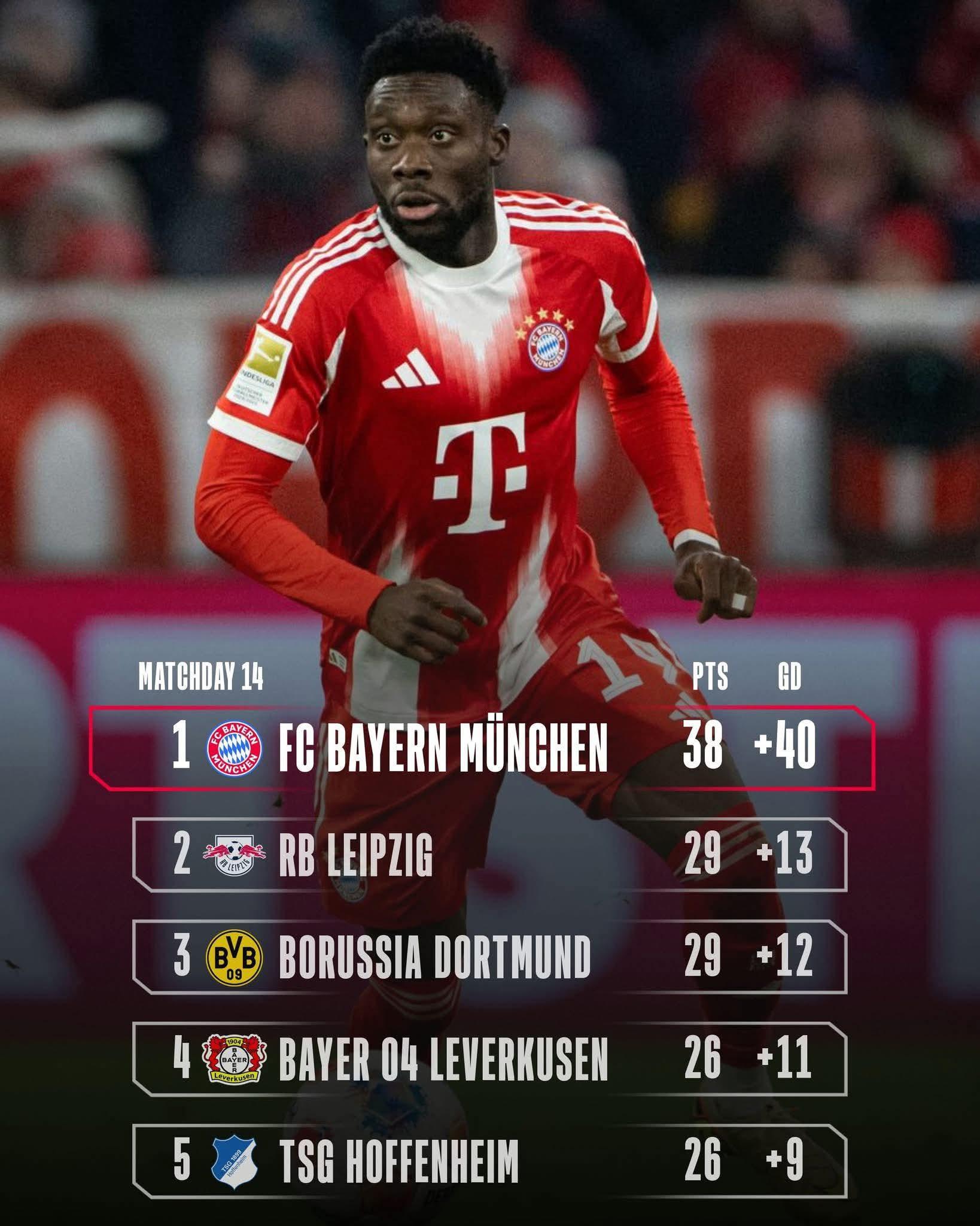 FC Bayern München weli waa hoggaanka Bundesliga — 38 dhibcood , +40 farqi gool still unbeaten