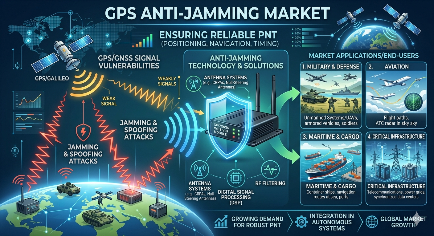 The increasing reliance on satellite-based navigation technologies across defense, aerospace, and transportation sectors is strengthening the need for solutions that protect positioning and navigation signals from interference. Positioning, navigation, and timing (PNT) systems are critical for applications such as military operations, aviation guidance, maritime navigation, and infrastructure monitoring. However, GPS signals are inherently weak when they reach the Earth’s surface, making them vulnerable to jamming and signal interference. As electronic warfare threats and navigation disruptions increase, governments and industries are investing in advanced technologies that ensure reliable and secure satellite navigation.