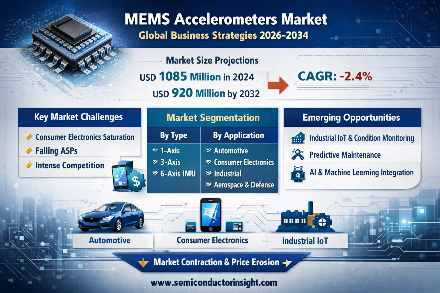 MEMS Accelerometers Market size was valued at USD 1085 million in 2024 and is projected to reach USD 920 million by 2032, exhibiting a negative CAGR of -2.4% during the forecast period. This market contraction, detailed in a comprehensive new report published by Semiconductor Insight, reflects the complex dynamics of a mature technology undergoing significant price erosion and integration trends, even as unit volumes continue to expand in key application areas.