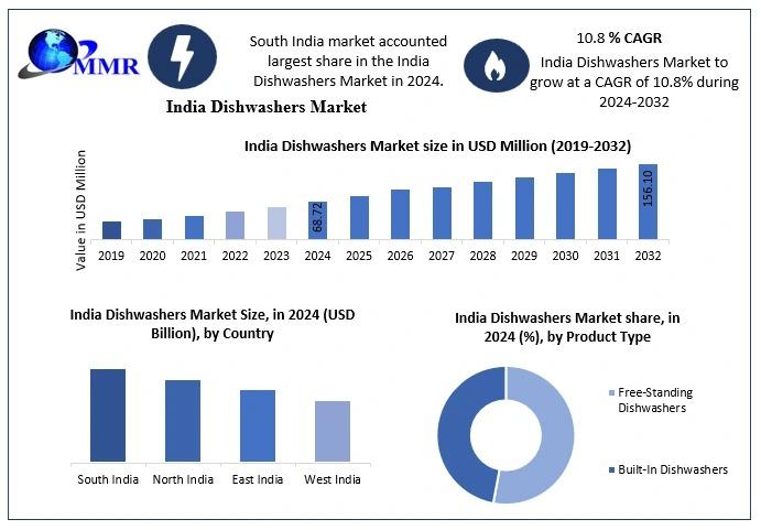 India Dishwashers Market size was valued at USD 68.72 Mn in 2024 and is expected to reach USD 156.10 Mn by 2032, at a CAGR of 10.8 %