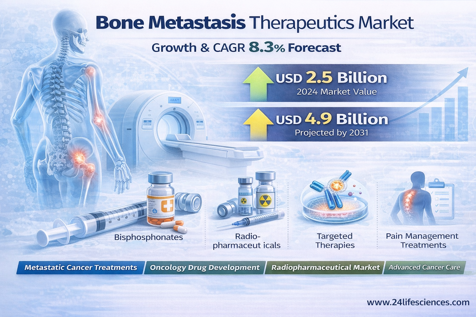 According to a newly published market research report by 24LifeSciences, global bone metastasis therapeutics market was valued at USD 2.5 billion in 2024 and is projected to reach USD 4.9 billion by 2031, growing at a compound annual growth rate (CAGR) of 8.3% during the forecast period 20252031.