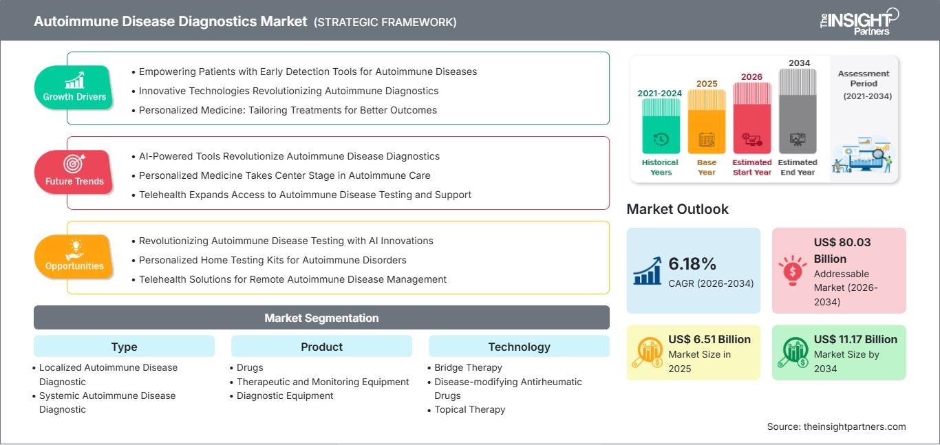 The Autoimmune Disease Diagnostics Market is projected to reach US$ 11.17 Billion by 2034, growing from US$ 6.51 Billion in 2025 at a CAGR of 6.18% during 2026–2034. Rising prevalence of autoimmune disorders, technological advancements, and expanding healthcare access are driving market growth. Autoimmune Disease Diagnostics Market Trends and Growth Analysis indicate increasing adoption of next-generation immunoassays, molecular diagnostics, and point-of-care testing, along with a focus on early disease detection and personalized treatment. These trends, coupled with public awareness campaigns and digital health integration, are reshaping the landscape of autoimmune diagnostics, improving patient outcomes and creating sustained growth opportunities across global markets.