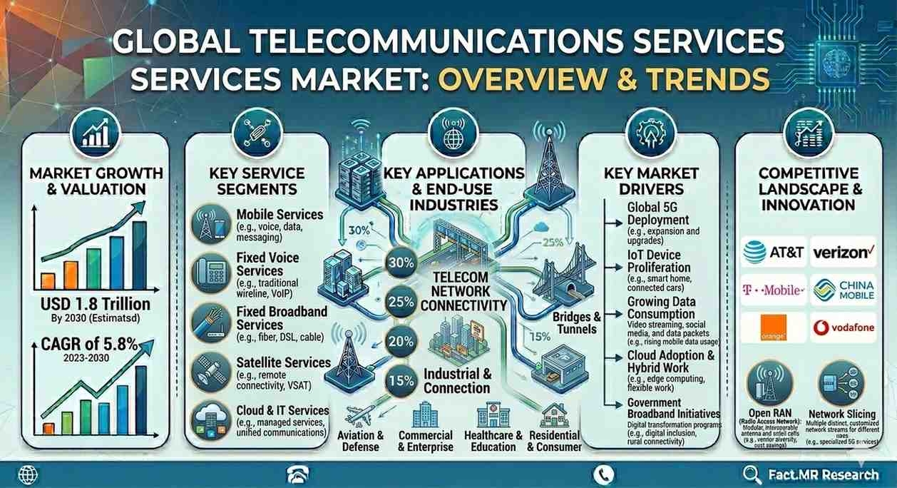 The telecommunications services market is evolving into digital connectivity ecosystems supporting smart cities, Industry 4.0, and cloud computing.