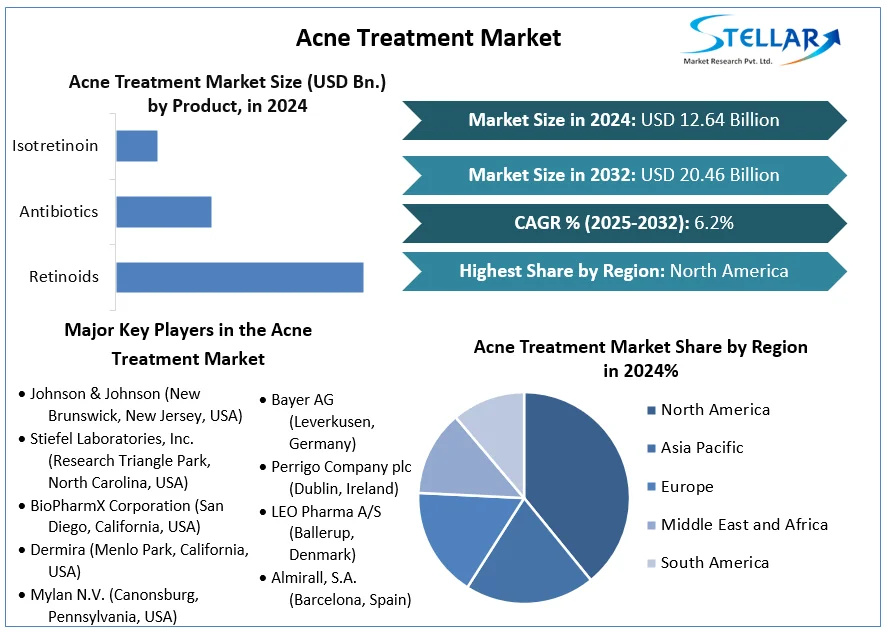 Acne Treatment Market size was valued at USD 12.64 Bn. in 2024 and is expected to reach USD 20.46 Bn. by 2032, at a CAGR of 6.2%.