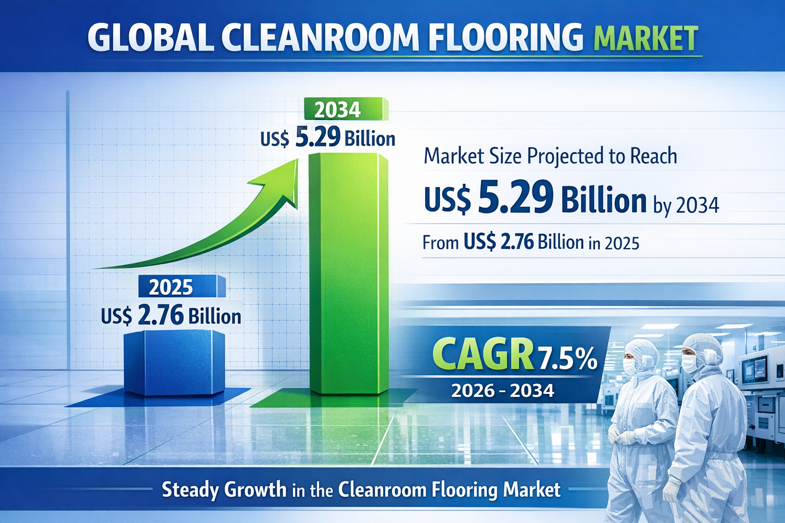 The global cleanroom flooring market is growing from US$ 2.76 billion in 2025 to US$ 5.29 billion by 2034 at a confirmed CAGR of 7.5%, reflecting the structural expansion of pharmaceutical biologic manufacturing, global semiconductor fabrication capacity investment, and the formalization of contamination control standards across laboratory research and medical device manufacturing environments that collectively make cleanroom flooring procurement non-discretionary for active controlled environment construction and renovation programs.