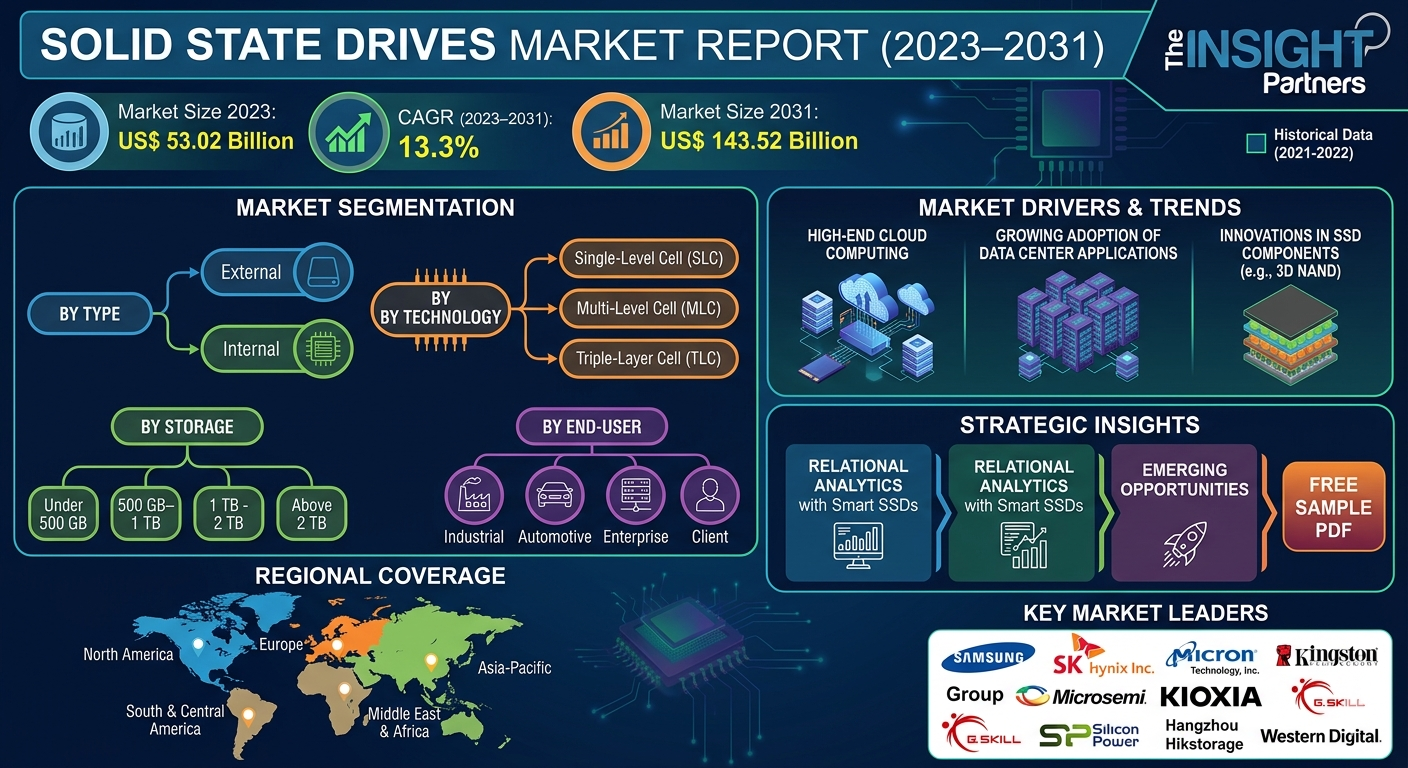 The Solid State Drives Market Share is experiencing steady growth as industries adopt modern storage solutions to support high-performance computing and digital transformation initiatives. The solid-state drives market size is projected to increase from US$ 53.02 billion in 2023 to US$ 143.52 billion by 2031, registering a CAGR of 13.3% during the forecast period from 2023 to 2031. The expansion of the industry is supported by rising investments in cloud computing infrastructure, the rapid growth of global data centers, and continuous advancements in flash memory technologies. As organizations continue to prioritize faster data processing and reliable storage infrastructure, the demand for SSD technology is expected to grow significantly over the coming years.