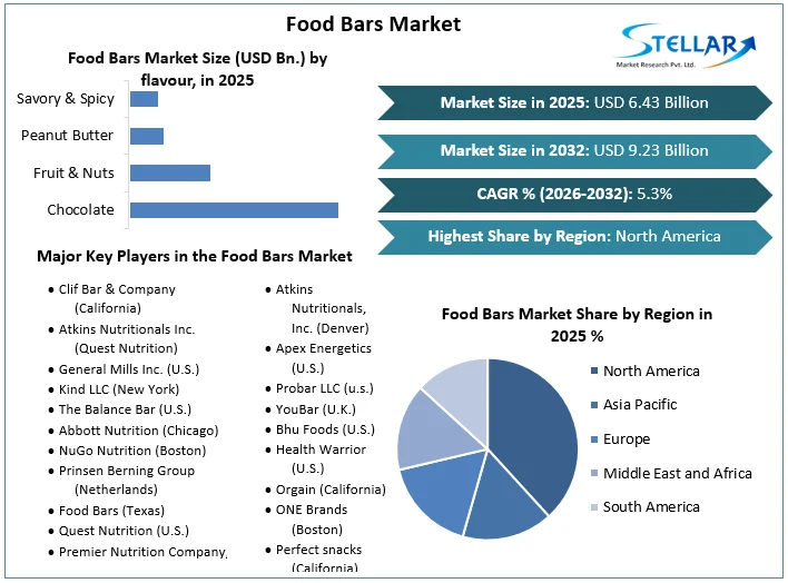 The Food Bars Market size was valued at USD 6.43 Bn. in 2025 and the total Global Food Bars revenue is expected to grow at a CAGR of 5.3% from 2026 to 2032, reaching nearly USD 9.23 Bn. by 2032.