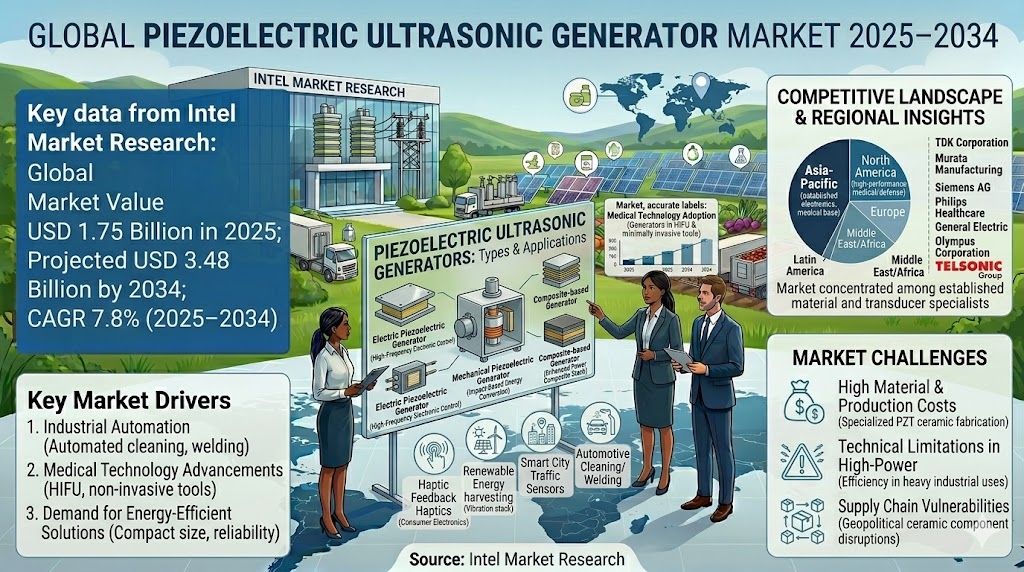 According to a new report from Intel Market Research, the global piezoelectric ultrasonic generator market was valued at USD 1.75 billion in 2025 and is projected to reach USD 3.48 billion by 2034, growing at a steady CAGR of 7.8% during the forecast period (2025-2034). This growth trajectory is fueled by increasing industrial automation, advancements in medical imaging technologies, and rising demand for precision non-destructive testing solutions across manufacturing sectors.