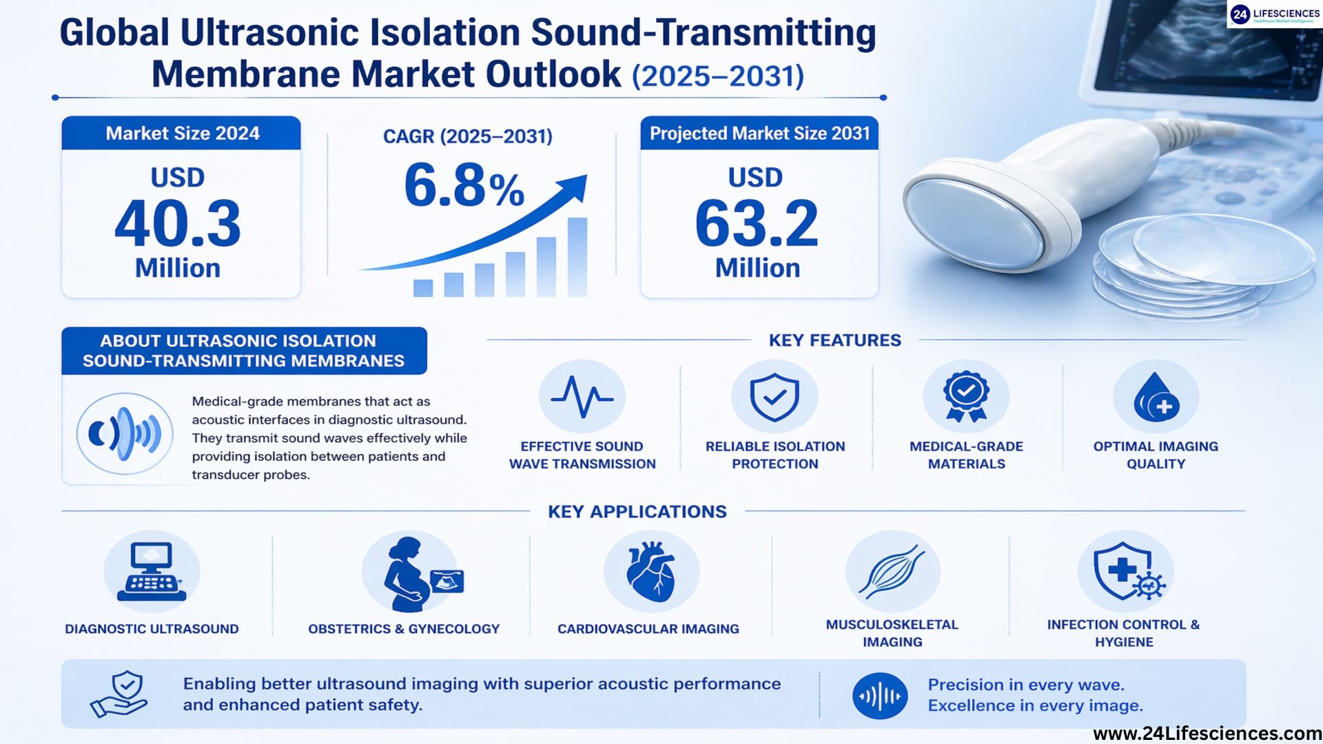 According to a newly published market research report by 24LifeSciences, global ultrasonic isolation sound-transmitting membrane market was valued at USD 40.3 million in 2024 and is projected to reach USD 63.2 million by 2031, growing at a compound annual growth rate (CAGR) of 6.8% during the forecast period 2025-2031.