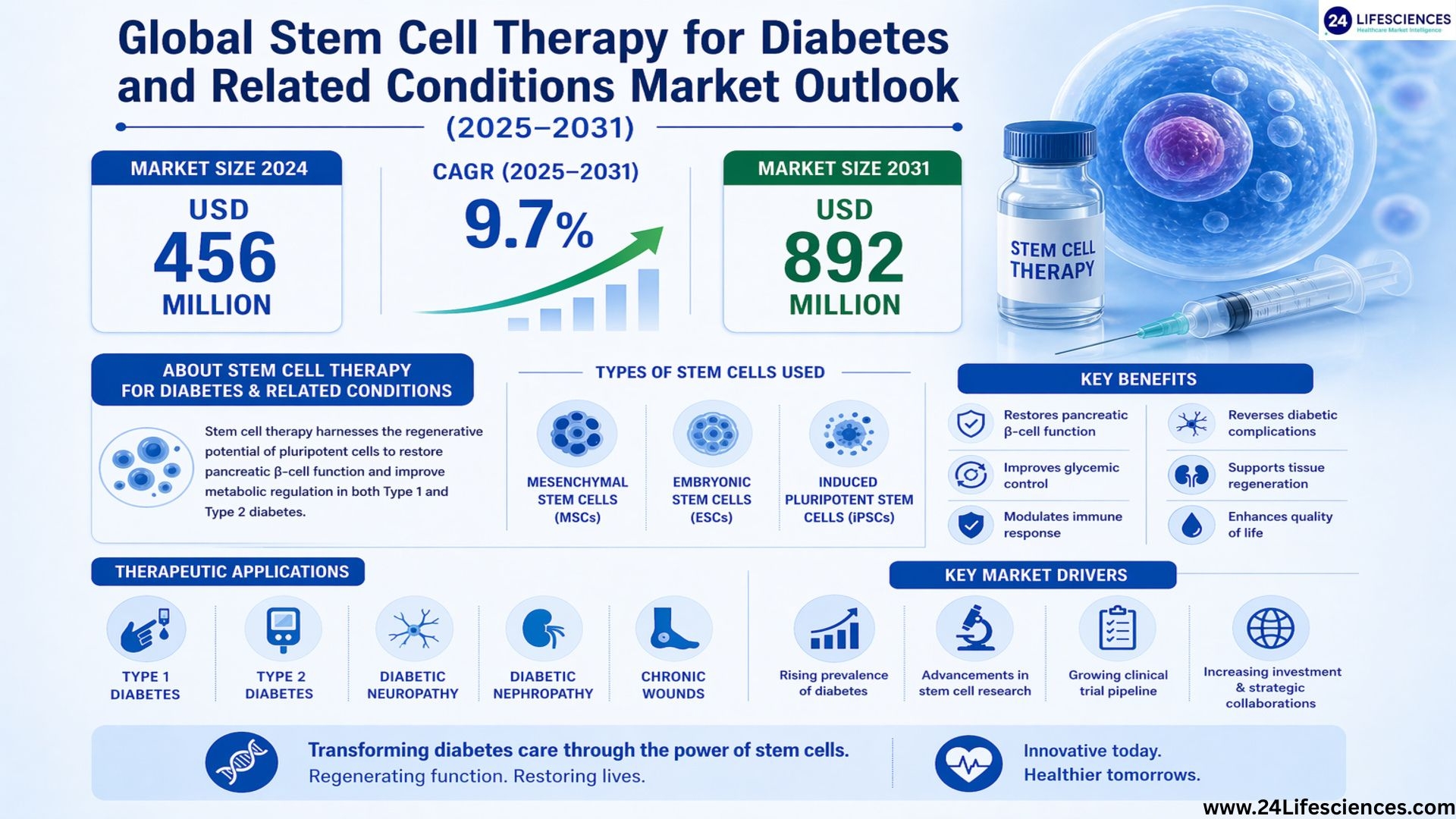 According to a newly published market research report by 24LifeSciencesglobal stem cell therapy for diabetes and related conditions market was valued at USD 456 million in 2024 and is projected to reach USD 892 million by 2031, growing at a compound annual growth rate (CAGR) of 9.7% during the forecast period 2025–2031.