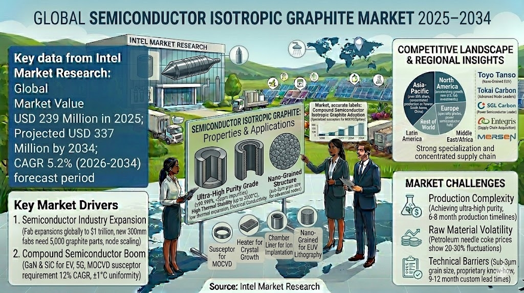 According to a new report from Intel Market Research, the global Semiconductor Isotropic Graphite market was valued at USD 239 million in 2025 and is projected to reach USD 337 million by 2034, growing at a steady CAGR of 5.2% during the forecast period (2026-2034). This growth trajectory reflects the expanding semiconductor manufacturing sector's demand for high-performance materials that can withstand extreme processing conditions while maintaining ultra-high purity standards.