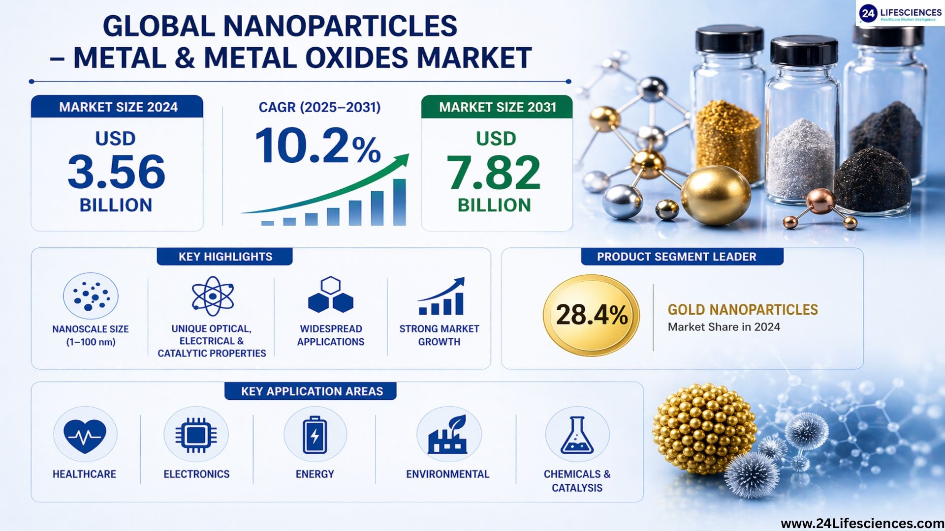 According to a newly published market research report by 24LifeSciences, global nanoparticles - metal & metal oxides market was valued at USD 3.56 billion in 2024 and is projected to reach USD 7.82 billion by 2031, growing at a compound annual growth rate (CAGR) of 10.2% during the forecast period 2025-2031.
