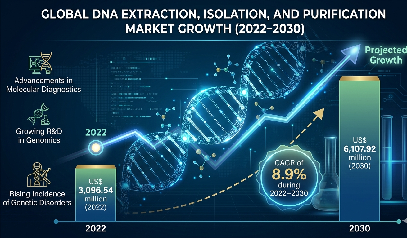 The DNA extraction, isolation, and purification market has emerged as a crucial segment within the life sciences and biotechnology industries. The increasing demand for advanced molecular diagnostics, personalized medicine, and genetic research is significantly driving market growth. DNA extraction is a fundamental step in various applications, including clinical diagnostics, forensic science, and pharmaceutical research, making it indispensable in modern healthcare systems. The DNA Extraction, Isolation, and Purification market was valued at US$ 3,096.54 million in 2022 and is projected to reach US$ 6,107.92 million by 2030. It is estimated to register a CAGR of 8.9% during 2022–2030.
