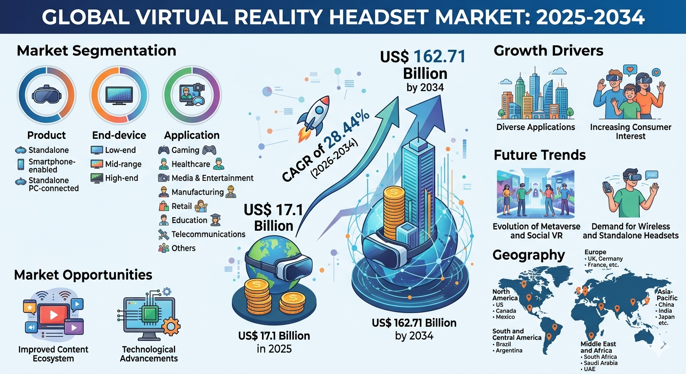 The Virtual Reality Headset Market Growth is witnessing strong global momentum, driven by rising adoption across consumer and enterprise applications. The global virtual reality headset market size is projected to reach US$ 162.71 billion by 2034 from US$ 17.1 billion in 2025, registering a CAGR of 28.44% during the forecast period from 2026 to 2034. This growth is supported by increasing investments in immersive technologies, expanding application areas, and continuous product development across the VR ecosystem.