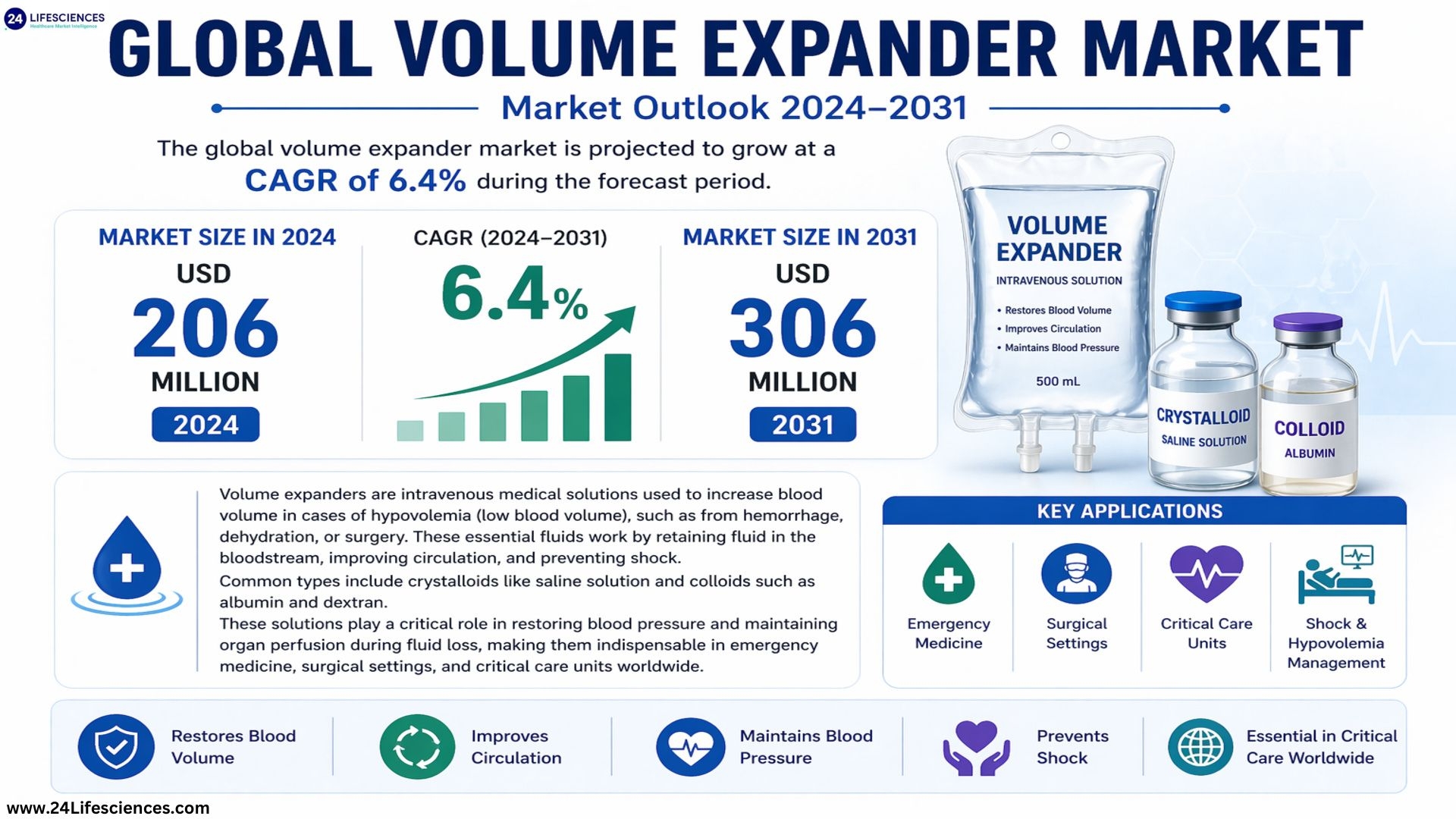 According to a newly published market research report by 24LifeSciencesglobal volume expander market was valued at USD 206 million in 2024 and is projected to reach USD 306 million by 2031, growing at a compound annual growth rate (CAGR) of 6.4% during the forecast period.