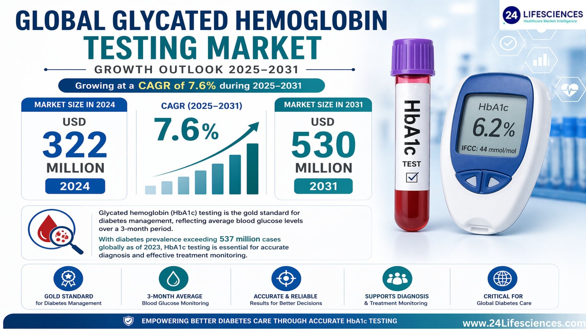 According to a newly published market research report by 24LifeSciences, global glycated hemoglobin testing market was valued at USD 322 million in 2024 and is projected to reach USD 530 million by 2031, growing at a compound annual growth rate (CAGR) of 7.6% during the forecast period 2025-2031.