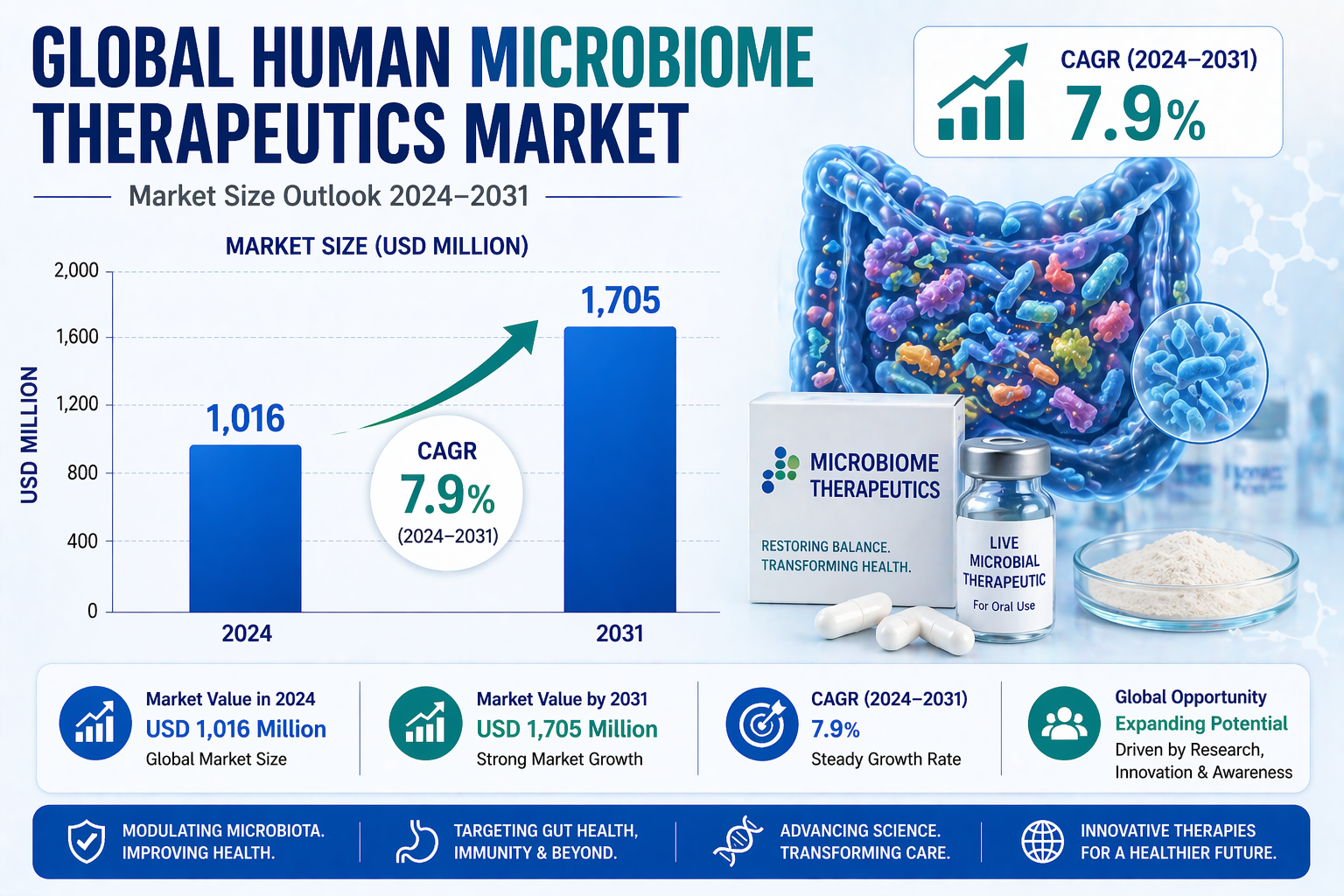 According to a newly published market research report by 24LifeSciences, global human microbiome therapeutics market was valued at USD 1,016 million in 2024 and is projected to reach USD 1,705 million by 2031, growing at a compound annual growth rate (CAGR) of 7.9% during the forecast period 2024–2031.