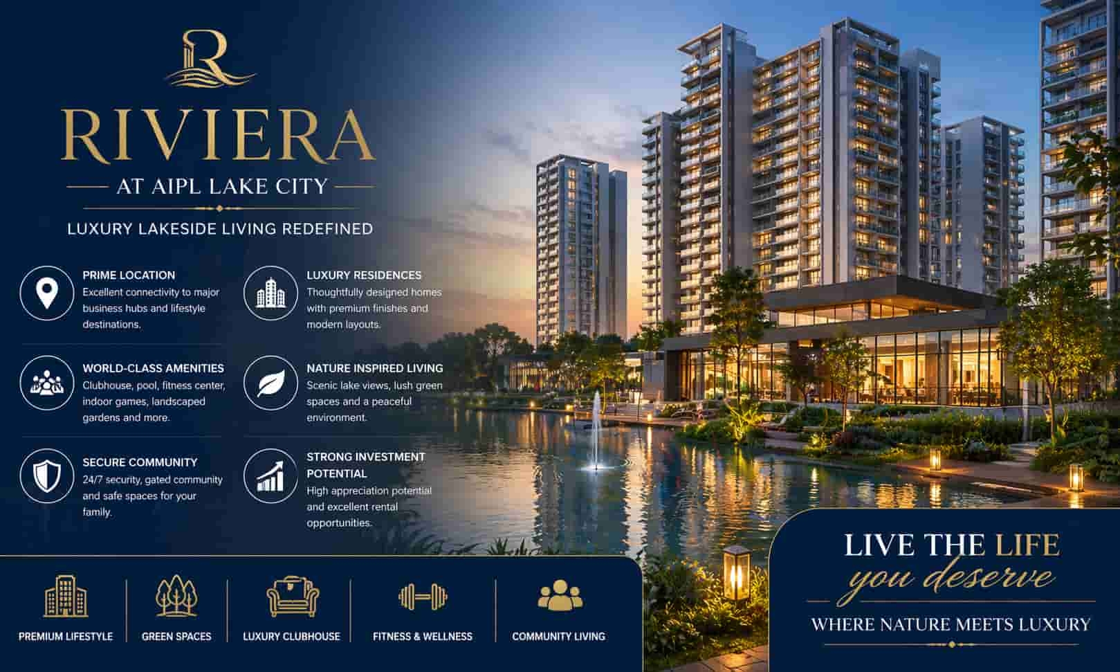 Riviera at AIPL Lake City is a luxury residential development designed for modern urban living. It offers premium residences surrounded by landscaped greens, water-inspired aesthetics, and world-class amenities.