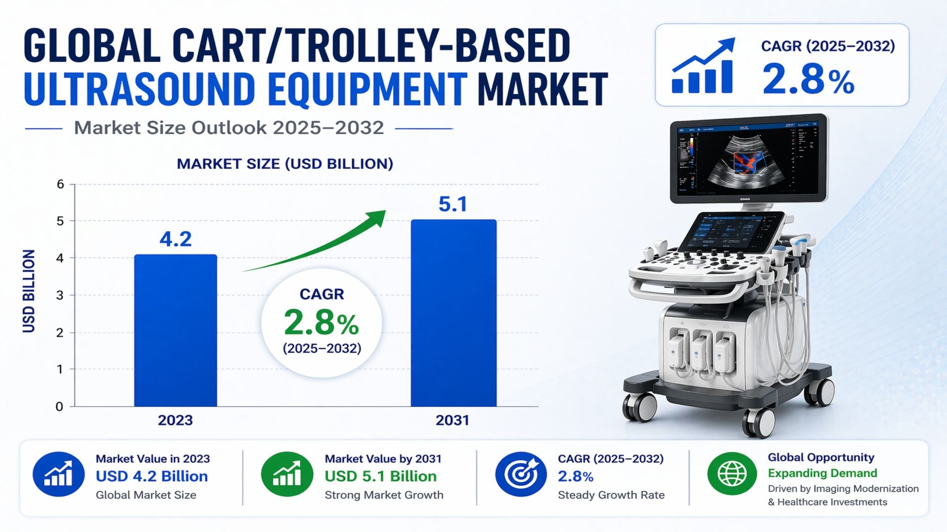 Cart or trolley-based ultrasound equipment market was valued at USD 4.2 billion in 2023 and is projected to reach USD 5.1 billion by 2031, expanding at a compound annual growth rate (CAGR) of 2.8% during the forecast period from 2025 to 2032. This growth reflects the continued importance of ultrasound imaging as a frontline diagnostic tool across emergency medicine, radiology, and critical care settings, supported by ongoing investments in hospital infrastructure and imaging modernization.