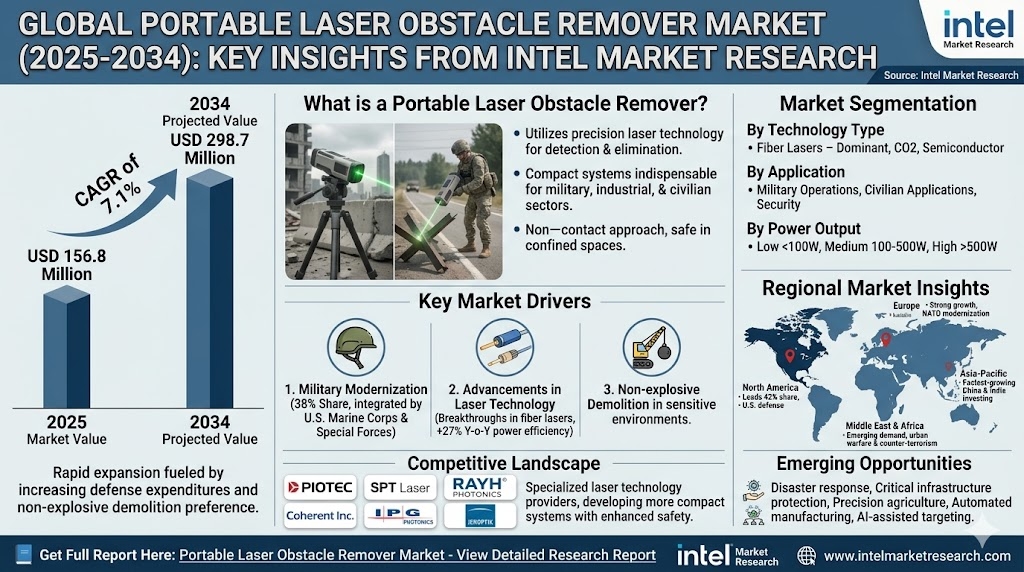 According to a new report from Intel Market Research, the global Portable Laser Obstacle Remover market was valued at USD 156.8 million in 2025 and is projected to reach USD 298.7 million by 2034, growing at a CAGR of 7.1% during the forecast period (2026-2034). This rapid expansion is fueled by increasing defense expenditures worldwide and the growing preference for non-explosive demolition solutions in urban environments.