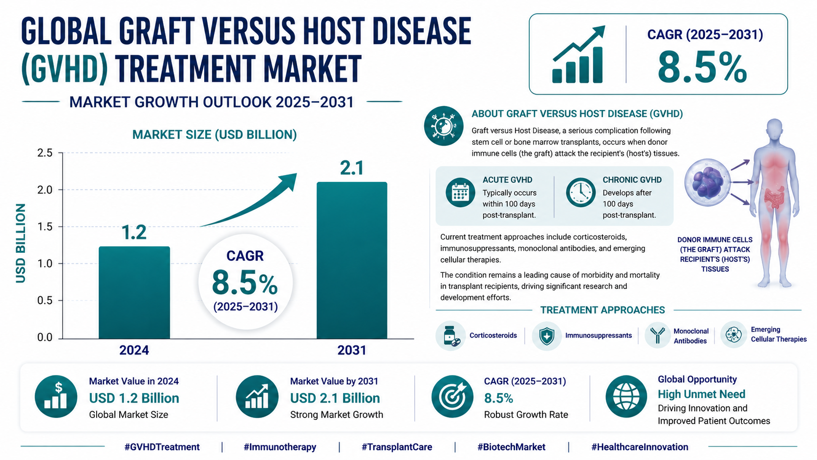 According to a newly published market research report by 24LifeSciences, global Graft Versus Host Disease (GVHD) Treatment market was valued at USD 1.2 billion in 2024 and is projected to reach USD 2.1 billion by 2031, growing at a compound annual growth rate (CAGR) of 8.5% during the forecast period 20252031.