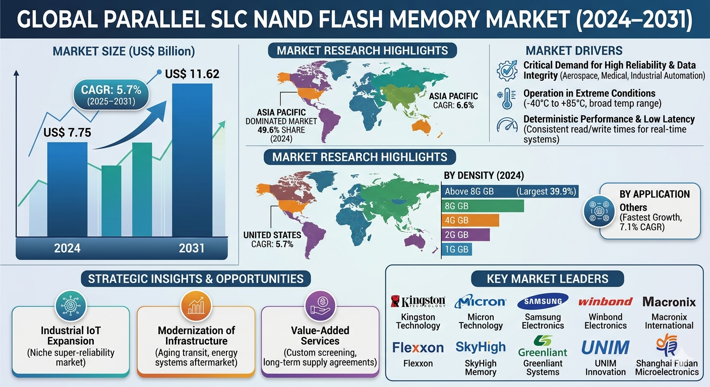 The Parallel SLC NAND Flash Memory Market Forecast is witnessing steady expansion, driven by its growing adoption in embedded systems and high-reliability infrastructure. Positioned at the core of advanced storage solutions, the market is projected to reach US$ 11.62 billion by 2031, up from US$ 7.75 billion in 2024, registering a CAGR of 5.7% during 2025–2031. This growth reflects increasing demand for durable and deterministic memory solutions across a wide range of industries.