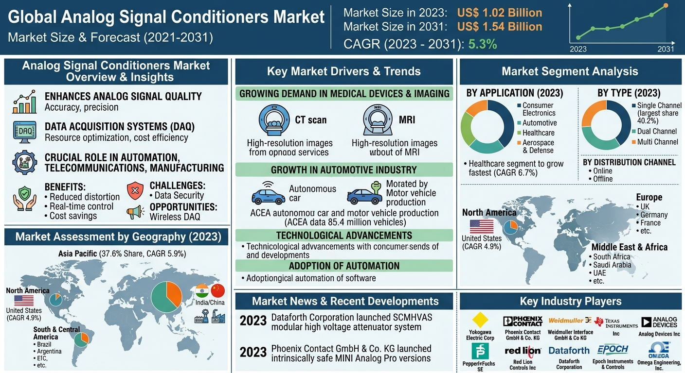 The Analog Signal Conditioners Market Growth is projected to grow from US$ 1.02 billion in 2023 to US$ 1.54 billion by 2031, registering a CAGR of 5.3% during the forecast period. Growth is driven by rising investments in industrial automation, increasing demand for advanced sensing and monitoring systems, and continuous expansion of global electronics manufacturing. The ongoing transition toward smart systems and connected industrial environments is further strengthening market development.