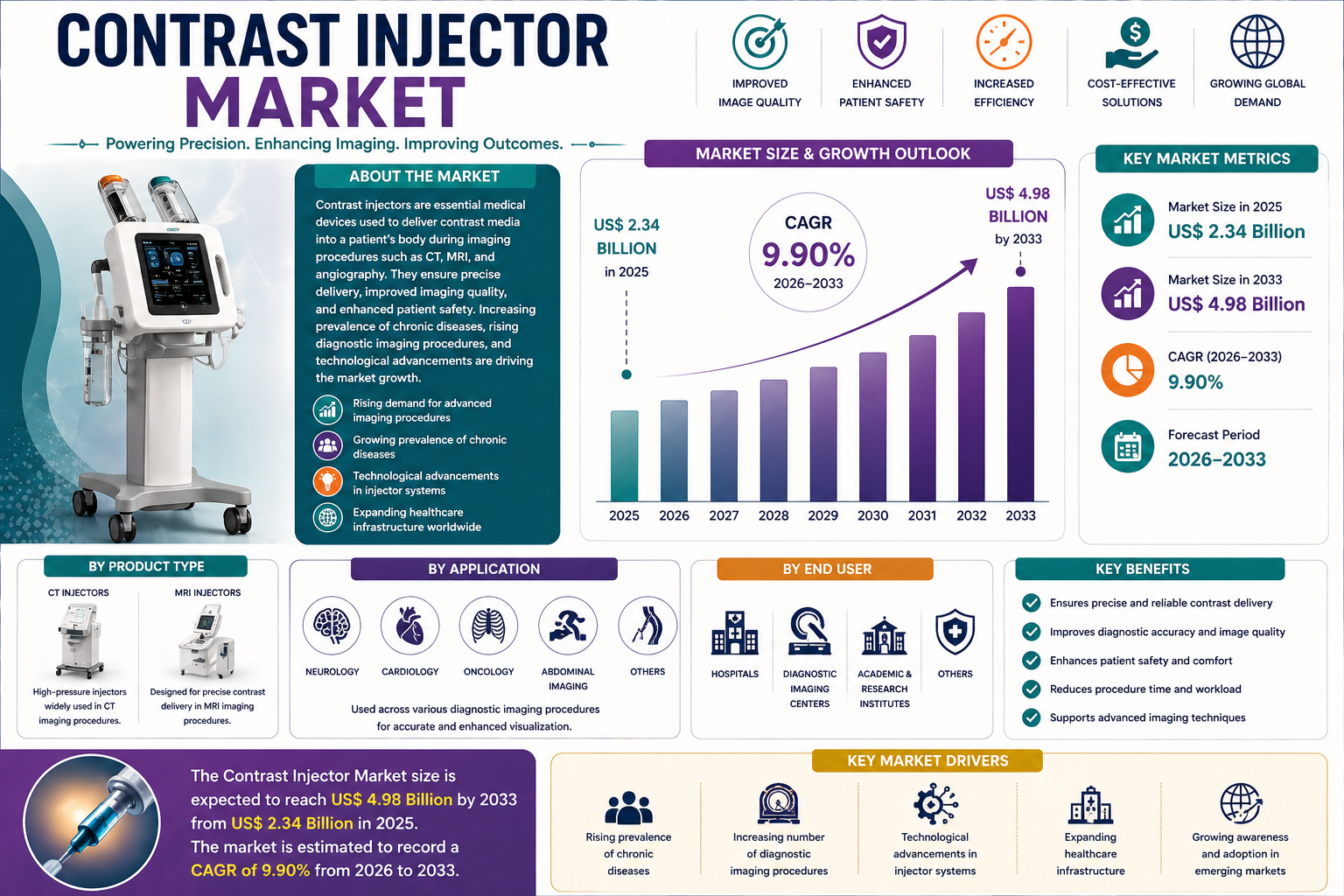 According to recent market intelligence, the sector is poised for robust financial growth over the next decade. The Contrast Injector Market size is expected to reach US$ 4.98 Billion by 2033 from US$ 2.34 Billion in 2025. The market is estimated to record a CAGR of 9.90% from 2026 to 2033.