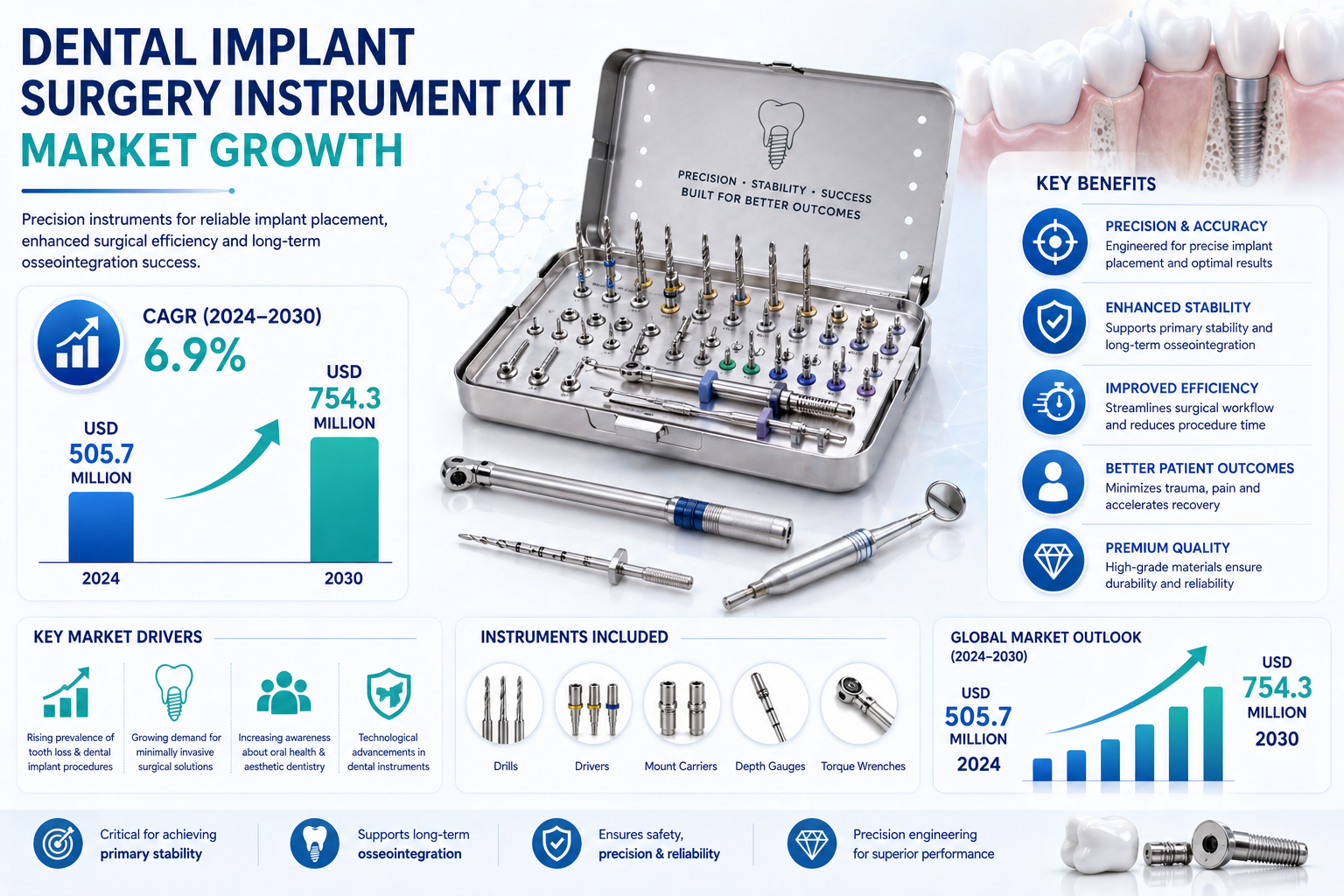 According to a newly published market research report by 24LifeSciences, global dental implant surgery instrument kit market was valued at USD 505.7 million in 2024 and is projected to reach USD 754.3 million by 2030, growing at a compound annual growth rate (CAGR) of 6.9% during the forecast period 2024–2030.