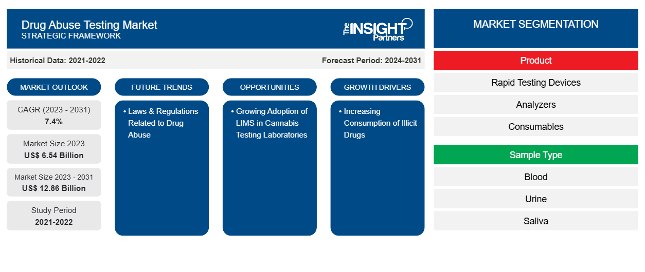 The drug abuse testing market size in 2021 stood at US$ 6.54 billion and is projected to reach US$ 12.86 billion by 2031. The market is expected to register a CAGR of 7.4% during 2023–2031.