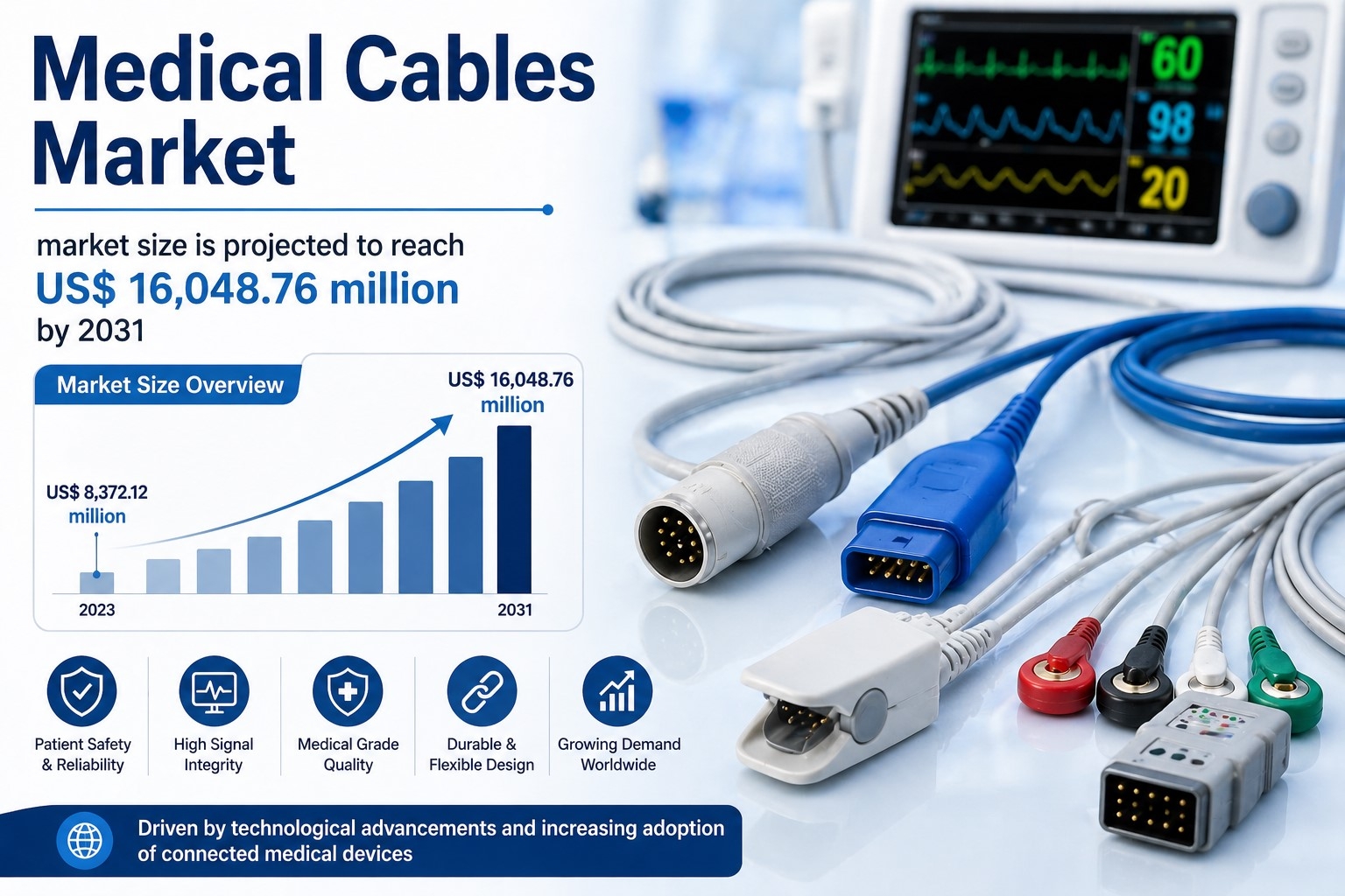 The Medical Cables Market is experiencing consistent growth as healthcare systems worldwide adopt advanced medical technologies and connected devices. The market is projected to grow from US$ 10,334.41 million in 2023 to US$ 16,048.76 million by 2031, registering a CAGR of 5.7% during 2023–2031. This growth is fueled by the increasing need for reliable connectivity solutions in diagnostic equipment, patient monitoring systems, and surgical devices. The rising prevalence of chronic diseases and the growing demand for efficient healthcare delivery systems continue to strengthen the adoption of medical cables globally.