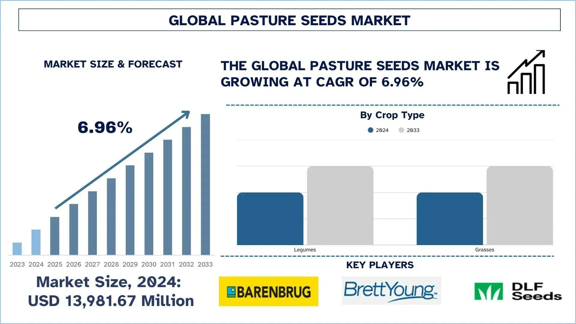 According to UnivDatos analysis, the rising global demand for sustainable livestock feed, technological advancements, and the increasing adoption of climate-resilient, high-yield seed varieties, coupled with a surge in mergers and acquisitions, are the major factors driving the growth of the pasture seeds market. As per their “Pasture Seeds Market” report, the global market was valued at USD 13,981.67 million in 2024, growing at a CAGR of about 6.96% during the forecast period from 2025 - 2033 to reach USD million by 2033.