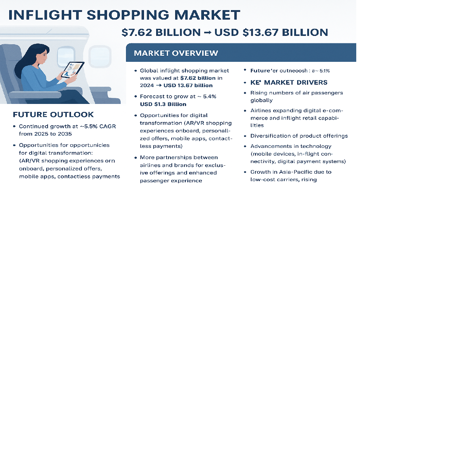 In sum, with rising air passenger volumes, evolving consumer preferences, enhanced product variety, and digital shopping infrastructure onboard aircraft, the inflight shopping market appears well positioned to nearly double in value by the mid-2030s. For airlines, retailers, and stakeholders in travel retail, this represents a significant opportunity — provided they adapt to changing travel patterns and consumer demands.