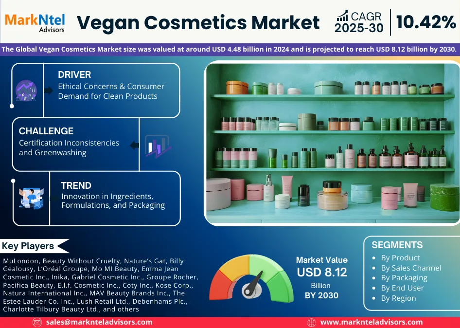 MarkNtel Advisors, a leading market research and consulting firm, has announced the release of its latest study titled Vegan Cosmetics Market Research Report: Forecast (2025–2030). This report provides a detailed assessment of the Vegan Cosmetics Market, covering its evolving dynamics, emerging trends, key growth drivers, major challenges, and competitive landscape.
