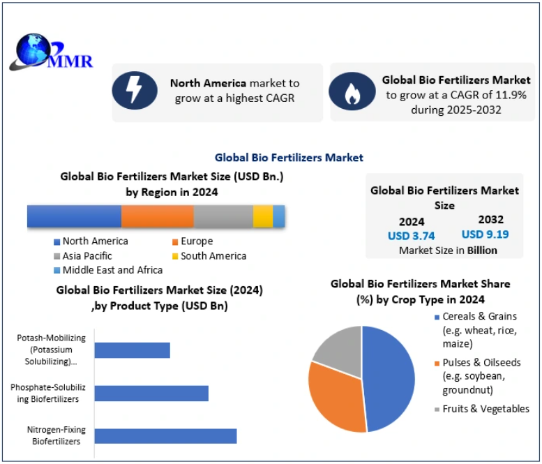 The global Bio Fertilizers Market was valued at USD 3.74 billion in 2024 and is projected to reach USD 9.19 billion by 2032, growing at a CAGR of 11.9% over the forecast period. Driven by the growing emphasis on sustainable agriculture, organic food production, and soil health, bio fertilizers are becoming an essential component for modern farming practices worldwide.