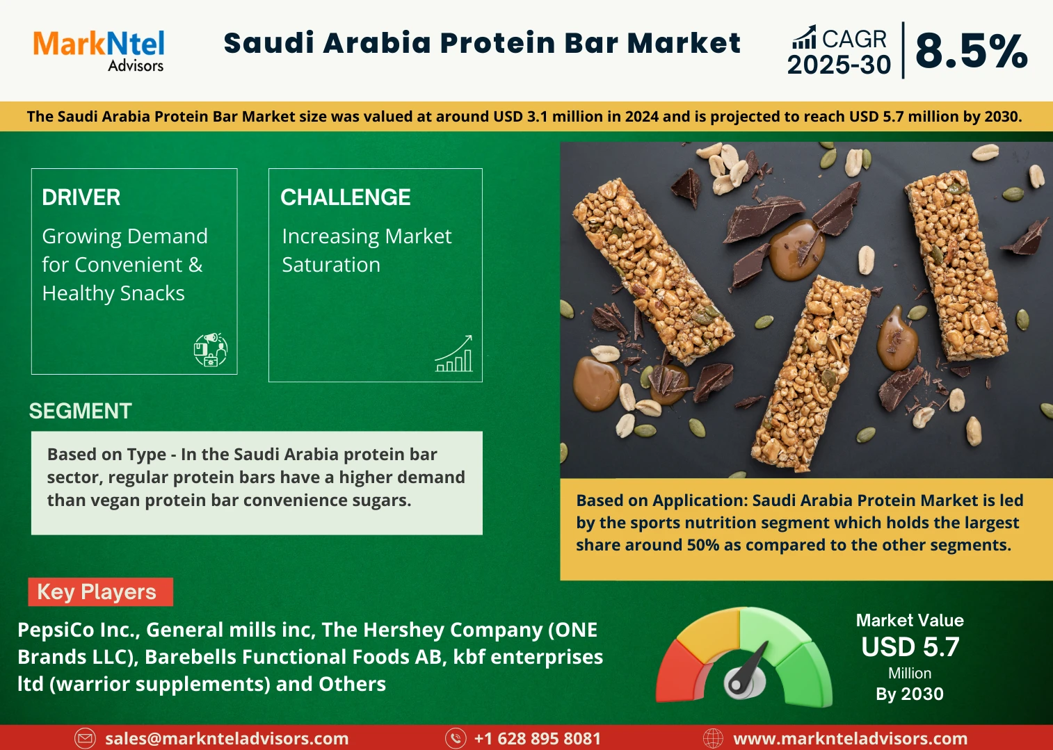MarkNtel Advisors, a leading market research and consulting firm, has announced the release of its latest study titled Saudi Arabia Protein Bar Market Research Report: Forecast (2025–2030). This report provides a detailed assessment of the Saudi Arabia Protein Bar Market, covering its evolving dynamics, emerging trends, key growth drivers, major challenges, and competitive landscape.
