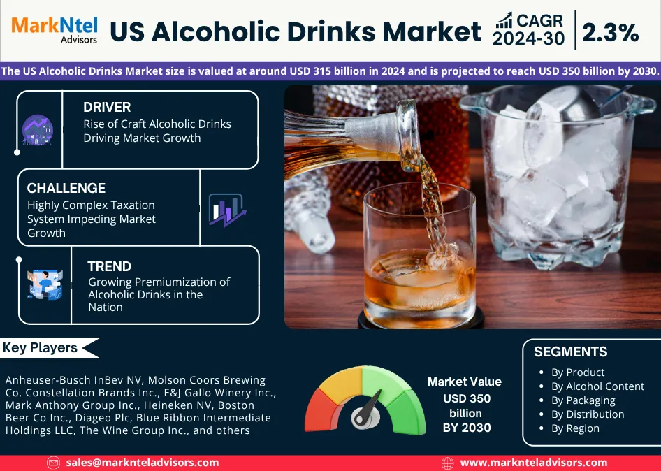 MarkNtel Advisors, a leading market research and consulting firm, has announced the release of its latest study titled US Alcoholic Drinks Market Research Report: Forecast (2024–2030). This report provides a detailed assessment of the US Alcoholic Drinks Market, covering its evolving dynamics, emerging trends, key growth drivers, major challenges, and competitive landscape.