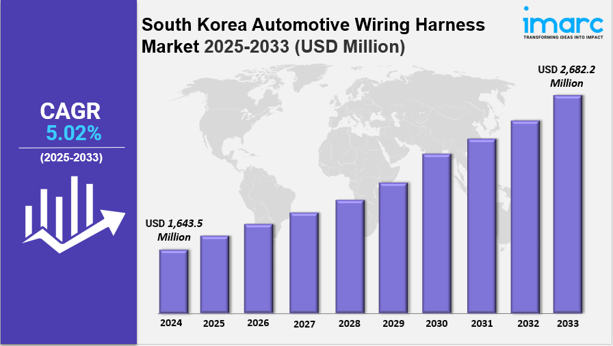 The South Korea Automotive Wiring Harness Market size reached USD 1,643.5 Million in 2024. It is projected to grow at a CAGR of 5.02% during the forecast period 2025-2033, reaching USD 2,682.2 Million by 2033. The market expansion is propelled by advancements in vehicle electronics, the rise of electric and autonomous driving systems, and stricter safety and connectivity standards. Suppliers' innovations in lightweight materials, modular designs, and smart harness solutions are also key drivers.