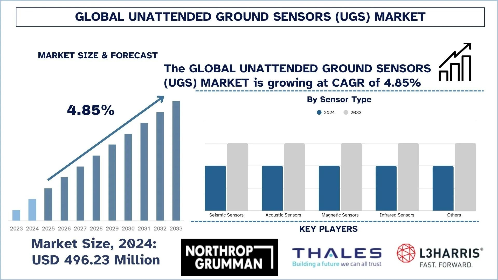 According to a new report by UnivDatos the Unattended Ground Sensors (UGS) Market is expected to reach USD million by 2033, growing at a CAGR of 4.85% during the forecast period (2025-2033F). The Global Unattended Ground Sensors Market is experiencing steady growth because of the accelerating requirements of persistent intelligence, surveillance, and reconnaissance (ISR), the demand to secure borders and protect perimeters, and the growing acceptance of UGS into network-centric warfare systems. As an essential force multiplier technology, UGS has begun to gain broad recognition as one of the significant components of the modern defense and security environment that offers real-time, covert surveillance on a broad spectrum of applications, other than on conventional battlefields. This is also enabled by improvements in sensor miniaturization, power efficiency, and data fusion, which, in turn, contribute to the system's reliability and deployment time. The market growth encompasses the strategic advancement of multi-sensing systems, the enhancement of communication standards, and the incorporation of artificial intelligence in data analysis, rendering the technology more autonomous and effective in global security forces than ever before.