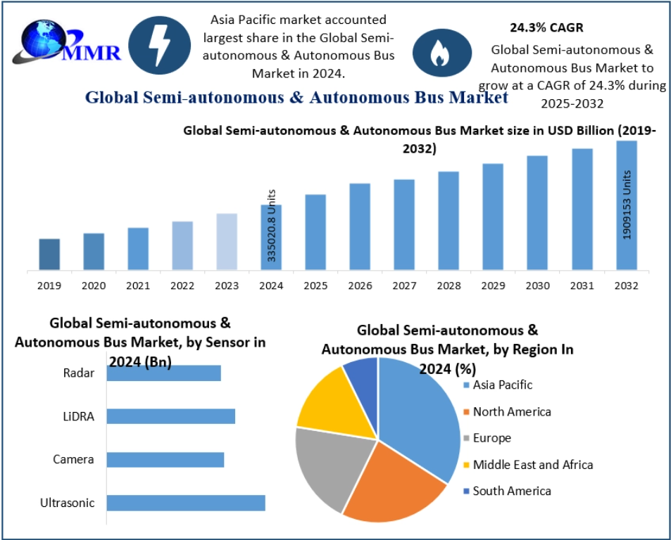 The Global Semi-autonomous & Autonomous Bus Market is undergoing rapid transformation as public transportation systems increasingly adopt intelligent mobility solutions. The market was valued at 335,020 units in 2024 and is projected to expand at a robust CAGR of 24.3% from 2025 to 2032, reaching nearly 1,909,153 units by 2032.