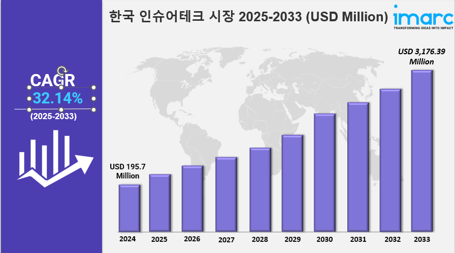 IMARC 그룹은 최근 "한국 인슈어테크 시장 규모, 점유율, 동향 및 유형, 서비스, 기술, 지역별 예측, 2025-2033"이라는 새로운 연구 연구를 발표했으며,  시장 동인, 세분화, 성장 기회, 동향 및 경쟁 환경에 대한 상세한 분석을 통해 현재와 미래의 시장 시나리오를 이해하고 있습니다.