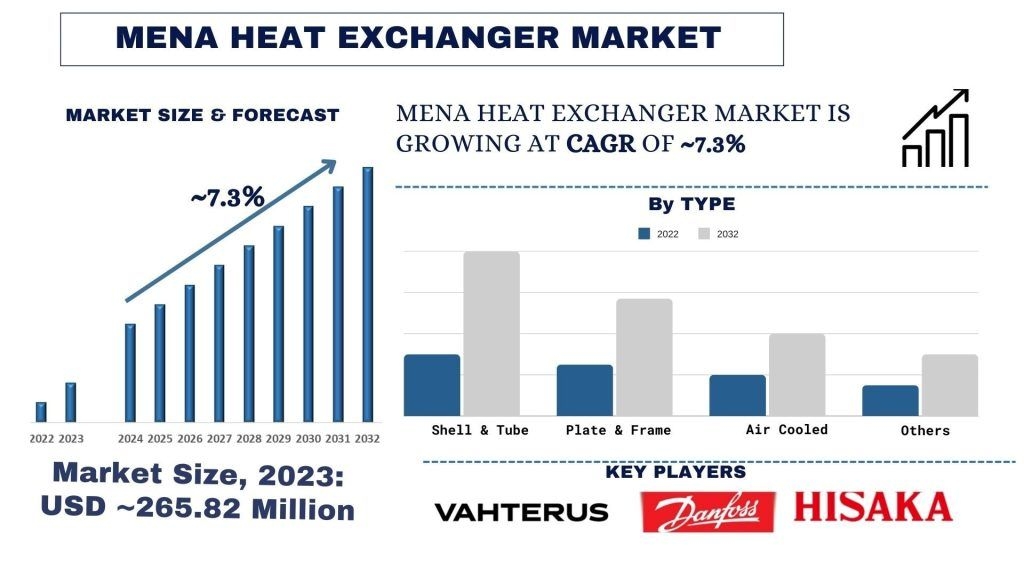 According to UnivDatos, rapid infrastructure development and an expanding project pipeline across the region are key factors driving market growth. As per the “MENA Heat Exchanger Market” report, the market was valued at USD 265.8 million in 2023 and is projected to grow at a CAGR of approximately 7.3% during the forecast period (2024–2032), reaching USD million by 2032.