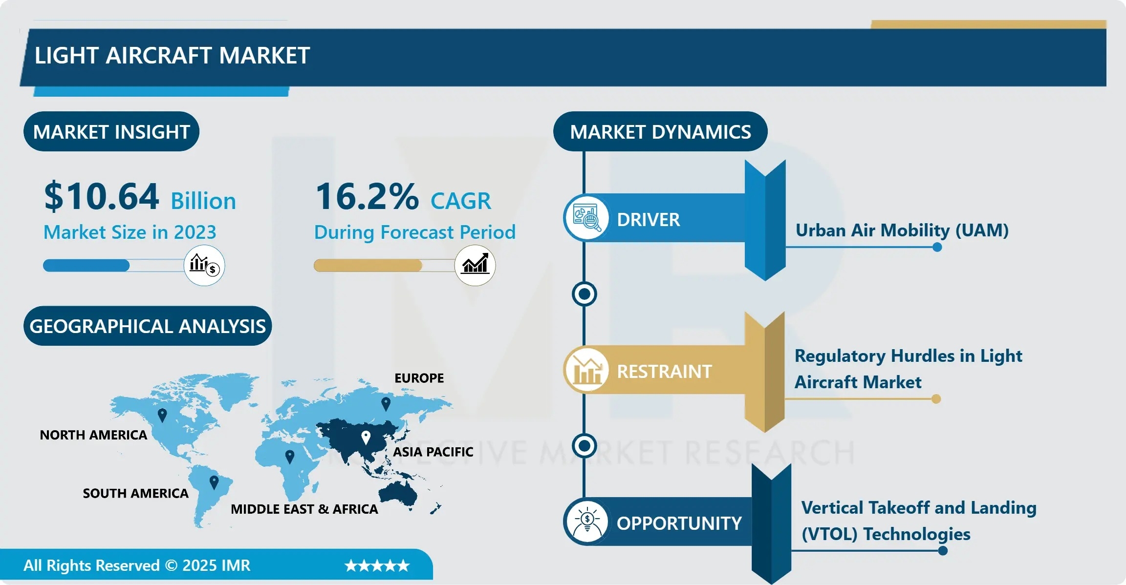 The Light Aircraft Market encompasses small, fixed-wing and rotary-wing aircraft typically with a maximum takeoff weight (MTOW) of 12,500 lbs or less, including single-engine piston planes, light jets, very light jets (VLJs), and helicopters. These aircraft offer significant operational and economic advantages over larger commercial airliners and older models, including lower acquisition and operating costs, shorter runway requirements, greater fuel efficiency, and versatility for point-to-point travel. They serve as essential tools for pilot training, private/business transportation, emergency medical services, agricultural work, and aerial surveying, filling a vital niche in the global aviation ecosystem.