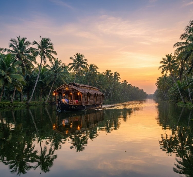 Imagine drifting gently through narrow canals lined with coconut palms. A traditional houseboat glides across still waters reflecting golden sunsets. Fishermen cast their nets at dawn while village life unfolds quietly along the banks.