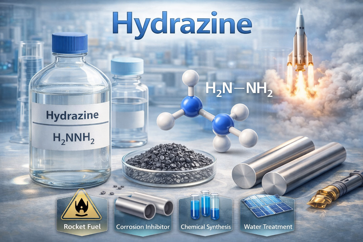 Hydrazine is a highly reactive and versatile chemical compound used as a reducing agent, blowing agent, corrosion inhibitor, and intermediate in chemical synthesis. It is commonly available in hydrazine hydrate form and plays a vital role in pharmaceuticals, agrochemicals, polymer foams, water treatment, and fuel cell technology.Hydrazine is widely utilized in the production of polymer foams used in insulation, automotive interiors, packaging, and construction materials