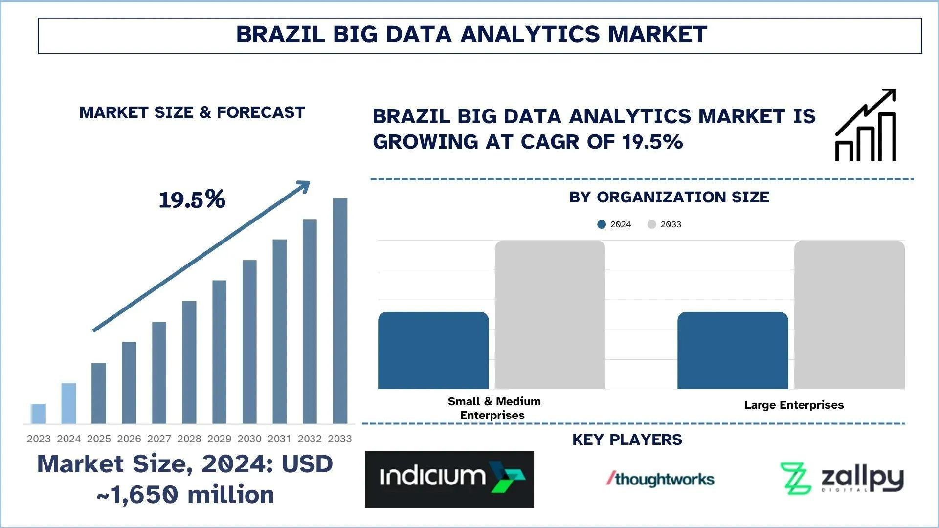 According to the UnivDatos, the robust government policies along with the extensive investments in the Data center establishment and ramping up of commercial and industrial usage of digital technologies would increase the demand for Big Data Analytics. As per their “Brazil Big Data Analytics Market” report, the Brazil market was valued at USD 1,650 million in 2024, growing at a CAGR of about 19.5% during the forecast period from 2025 - 2033 to reach USD million by 2033.