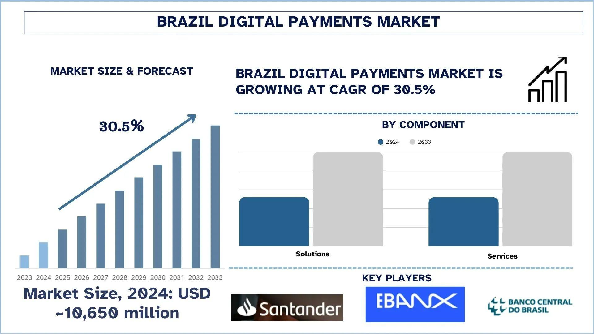 According to the UnivDatos , the robust government policies along with the extensive investments in digital payment and digital technologies would increase the demand for Digital Payments. As per their “Brazil Digital Payments Market” report, the Brazil market was valued at USD 10,650 million in 2024, growing at a CAGR of about 30.5% during the forecast period from 2025 - 2033 to reach USD million by 2033.