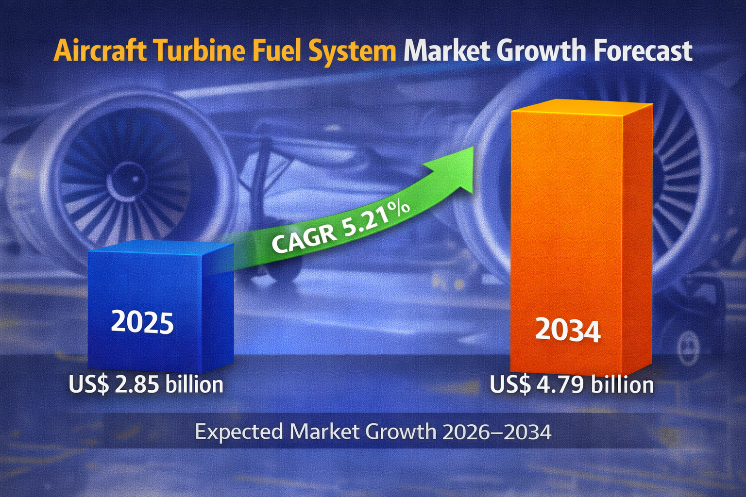 The global Aircraft Turbine Fuel System Market is projected to grow from US$ 2.85 billion in 2025 to US$ 4.79 billion by 2034, registering a steady CAGR of 5.21% during 2026–2034. The market’s growth is driven by increasing global aircraft production, modernization of defense fleets, and rising demand for fuel-efficient and technologically advanced propulsion systems.