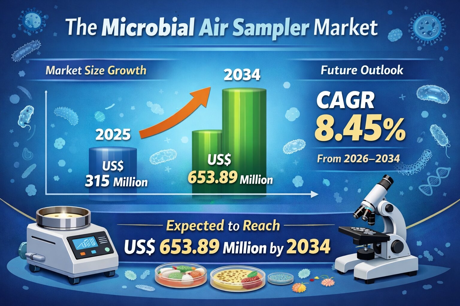 The Microbial Air Sampler Market is projected to grow from US$ 315.00 million in 2025 to US$ 653.89 million by 2034, registering a CAGR of 8.45% during 2026 to 2034. This steady expansion reflects the rising global emphasis on contamination control, regulatory compliance, and quality assurance across pharmaceutical, biotechnology, healthcare, and food manufacturing industries. Increasing industrialization and the expansion of sterile production facilities are also contributing to sustained demand for advanced microbial air monitoring systems.