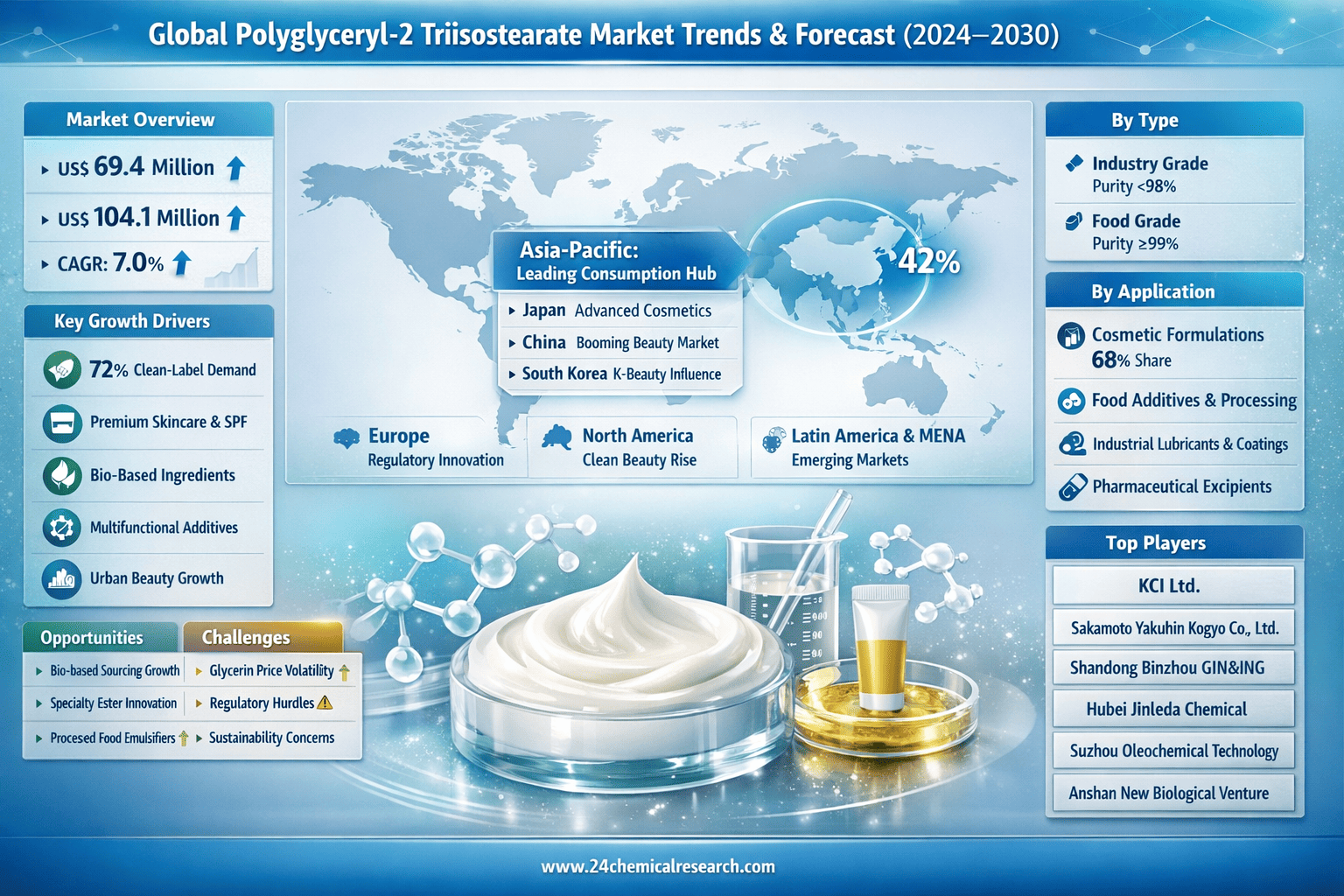 According to 24Chemical Research, Global Polyglyceryl-2 Triisostearate market demonstrates robust expansion trends, currently valued at USD 69.4 million in 2024 with projections indicating growth to USD 104.1 million by 2030, registering a CAGR of 7.0%. This stable upward trajectory stems from heightened demand across cosmetic formulations and specialty industrial applications, particularly in emerging economies where personal care industries are experiencing rapid urbanization-driven growth.